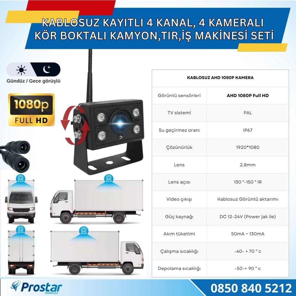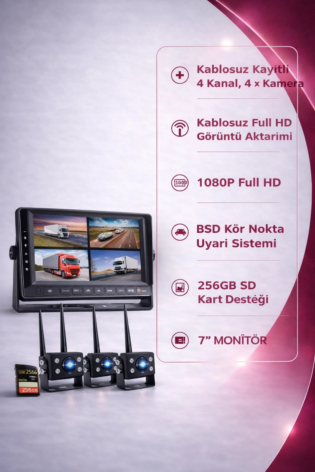 AHD 1080P Full HD 4 Adet Kablosuz Kameralı Kayıtlı 7″ Dört Kanal 256 GB SD Kart Destekli, BSD Kör Nokta Uyarı Sistemli, Yapay Zeka Destekli Tak Kullan Kolay Kullanım Kamera Seti