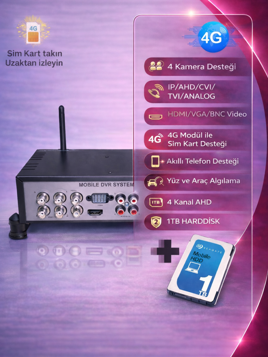 Uzaktan İzleme Destekli Mobil DVR Kayıt Cihazı + 1 TB Harddisk Dahil