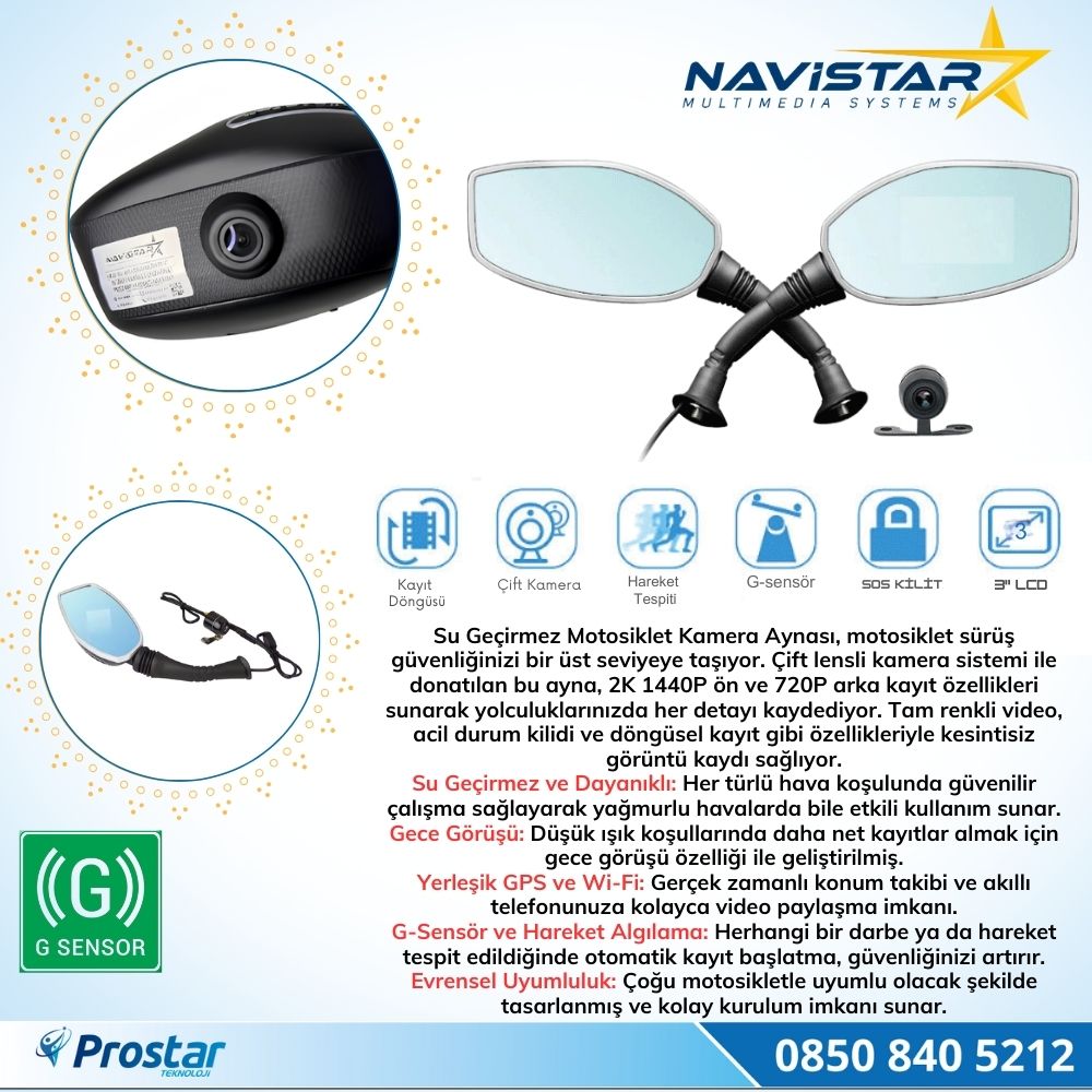 Navistar M796, motosiklet sürücüleri için özel olarak tasarlanmış çift kameralı güvenlik sistemidir. Ön kamera 2K 1440P ve arka kamera 720P çözünürlük ile sürüş güvenliğinizi maksimum seviyeye çıkarır.